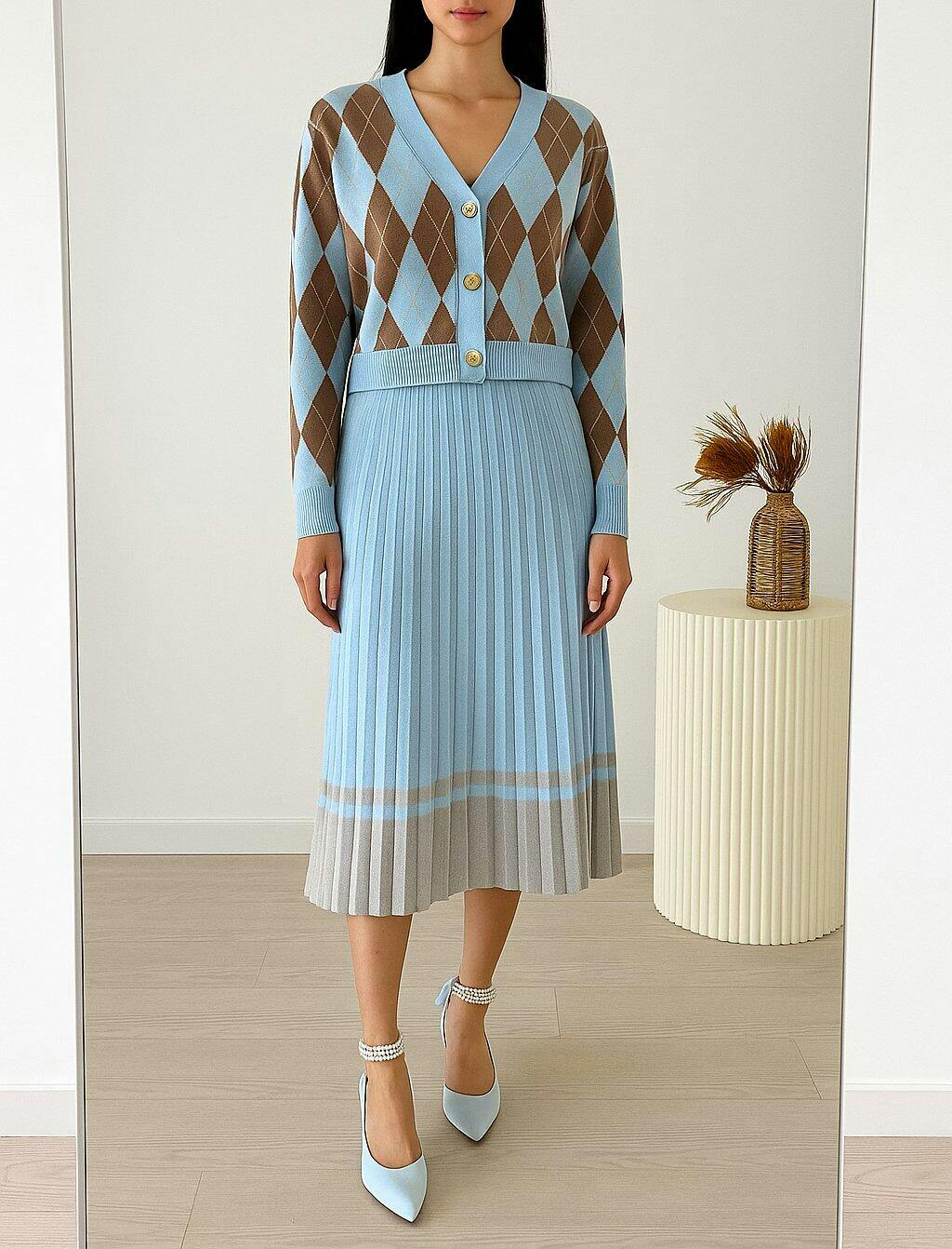 Introducing our Diamond Glow Cardigan Top—a stylish and comfortable addition to your wardrobe. This cardigan features a unique diamond pattern and is crafted from a blend of 64% Nylon, 15% Viscose, and 21% Polyester, ensuring a soft and cozy feel. The delightful color combination of Blue and Coffee adds a touch of sophistication to your ensemble.