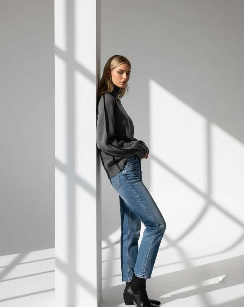 The ribbed turtleneck and hem offer subtle texture, while the slightly stretchy fabric ensures comfortable movement throughout the day. Perfect for pairing with tailored trousers, midi skirts, or denim - this sweater delivers timeless style with a contemporary edge.