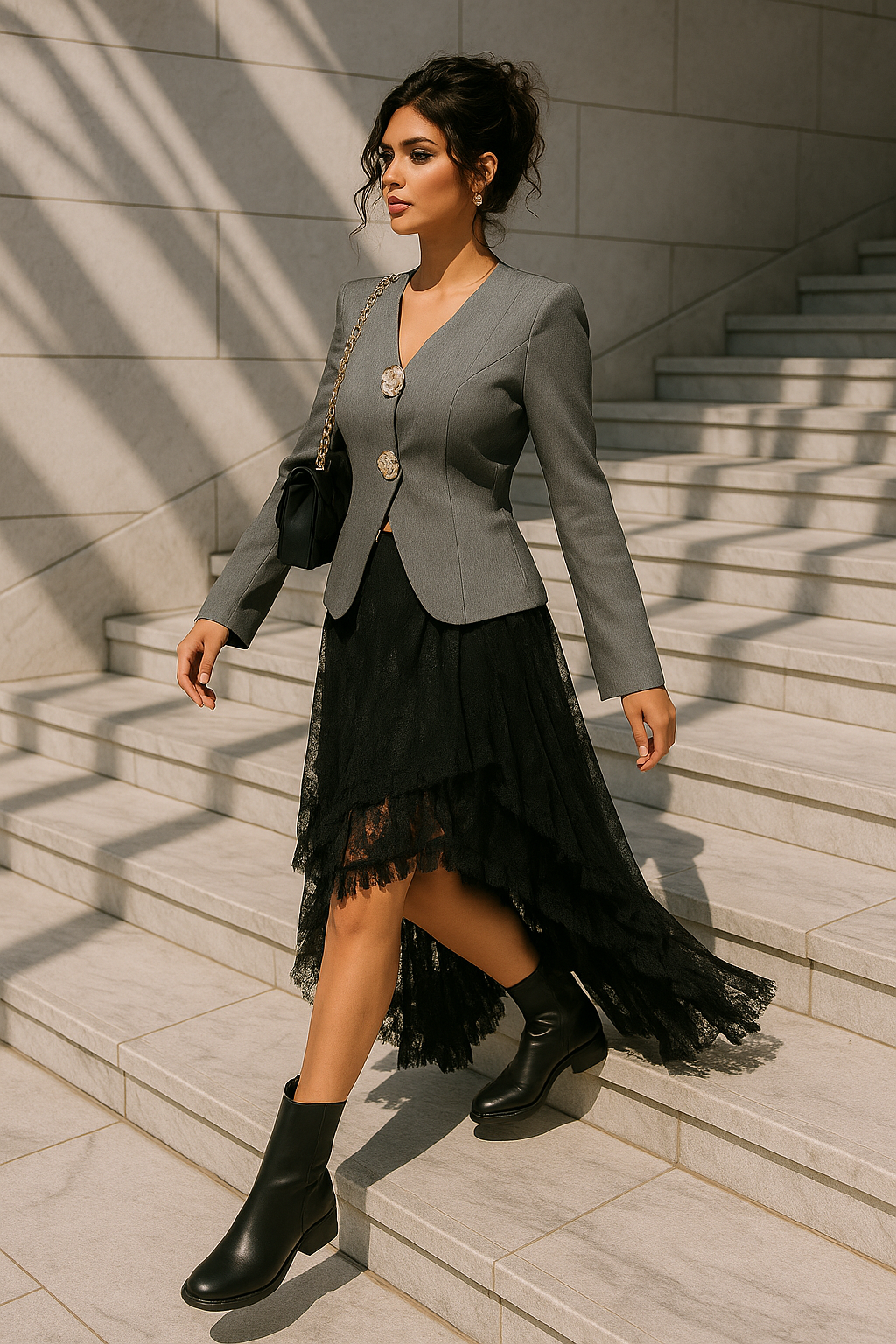 The Midnight Veil Lace Skirt is designed for the woman who moves like poetry — graceful, fearless, and unapologetically her own. Its cascading asymmetrical hem and soft lace layers create ethereal motion with every step. The elastic waistband ensures comfort without compromising elegance. Whether styled with heels, boots, or a structured blazer, this piece transforms your silhouette into a statement of subtle power and allure.