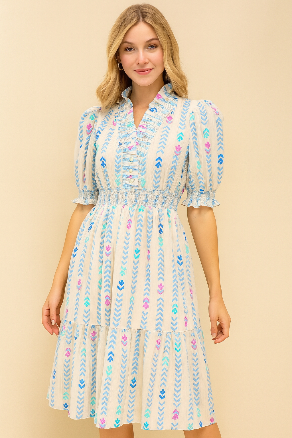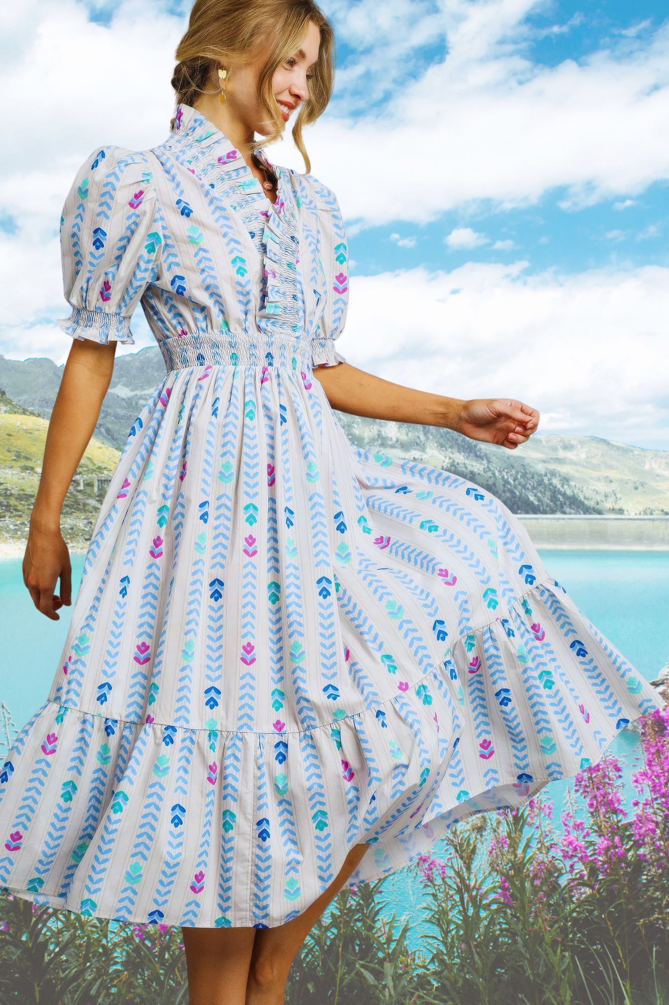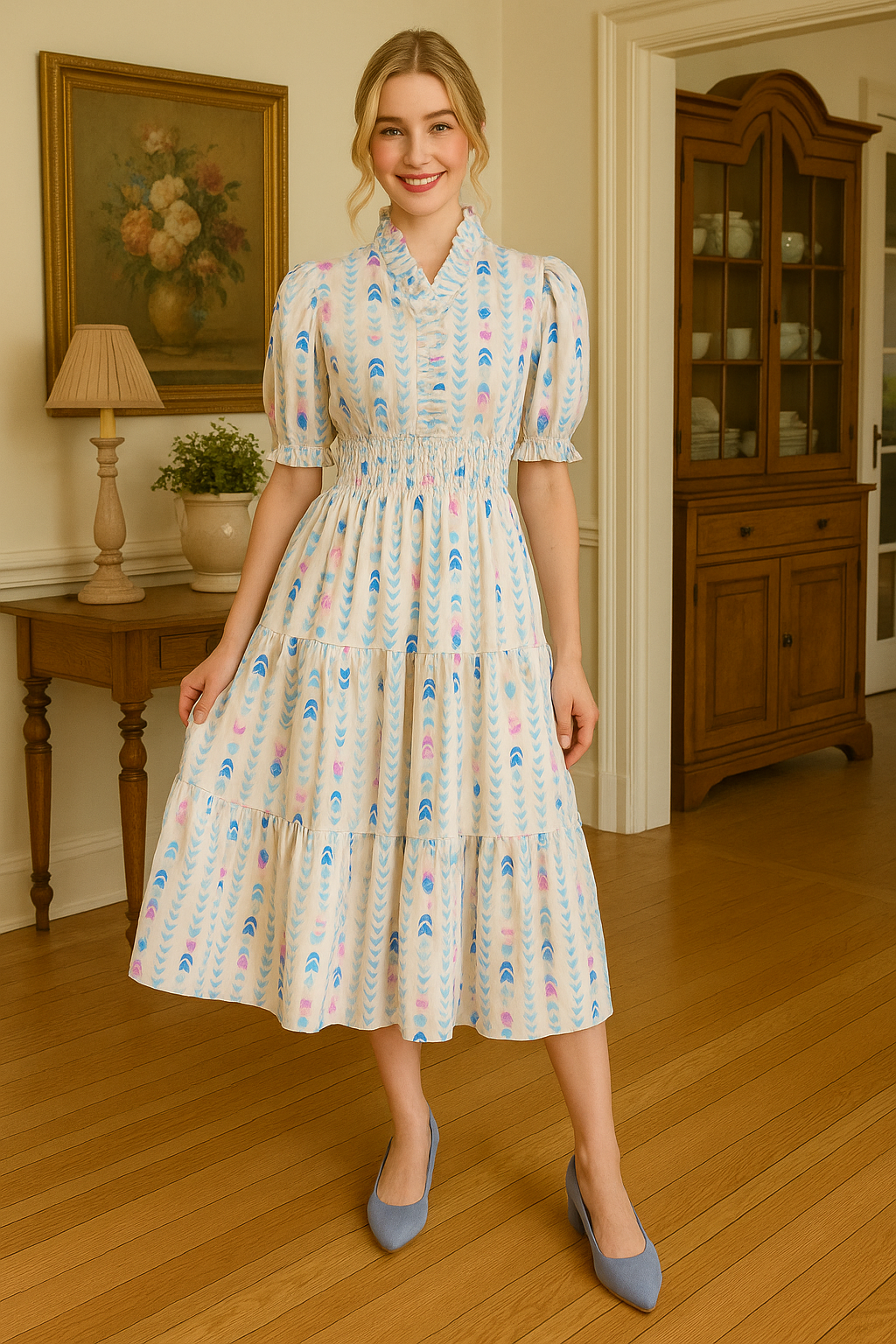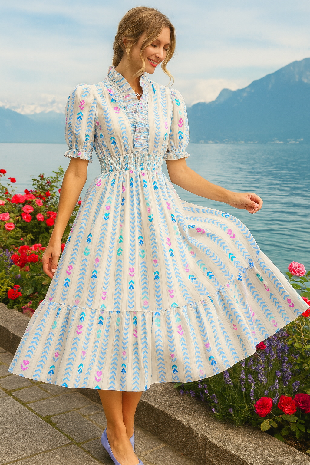 Hãy làm bừng sáng tủ đồ của bạn với Đầm Xếp Ly Luxe Smocked Ruffle, một sự kết hợp tinh tế giữa sự thoải mái và quyến rũ. Được làm từ 100% cotton thoáng khí, chiếc đầm này có phần eo chun co giãn, tôn lên vóc dáng của bạn mà vẫn mang lại sự thoải mái, dễ chịu. Tay áo phồng, bo gấu chun và viền bèo nhún tinh tế tạo nên nét lãng mạn, trong khi chân váy xếp tầng mang đến sự uyển chuyển uyển chuyển trong từng bước chân. Được thiết kế không lót, đầm nhẹ nhàng, lý tưởng cho những ngày nắng, những buổi dạo phố hay những chuyến đi chơi cuối tuần.